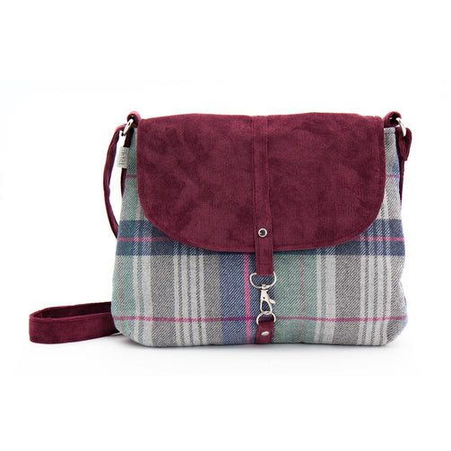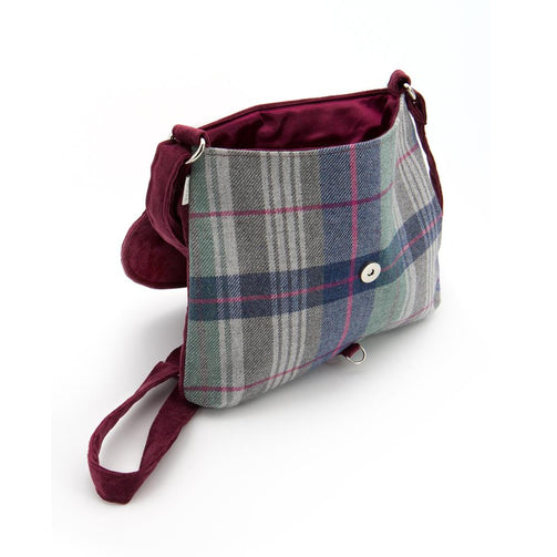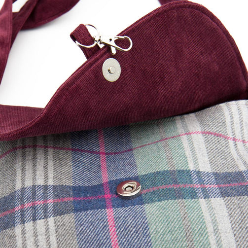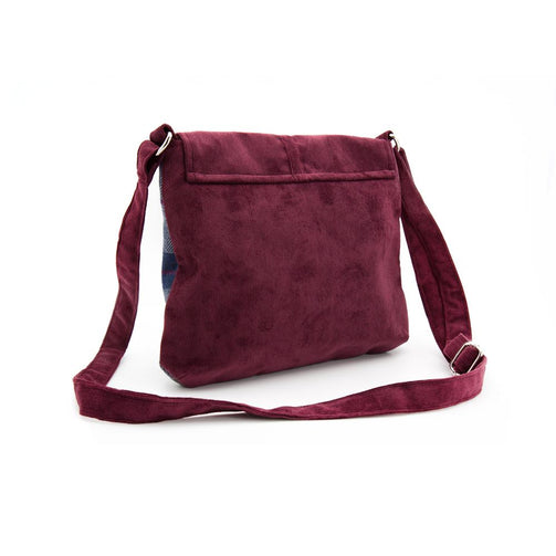 Borsa a tracolla media in tweed e velluto a coste bordeaux con patta e chiusura a calamita e gancio. Tracolla regolabile. Interno foderato e due tasche portaoggetti di cui una con zip.
