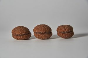 Il nostro cavallo di battaglia: i baci di dama. La formula è quella tradizionale: farina di mandorle, burro, zucchero di canna. A questa versione abbiamo aggiunto farina integrale di avena e cacao, per un gusto più goloso e pieno.