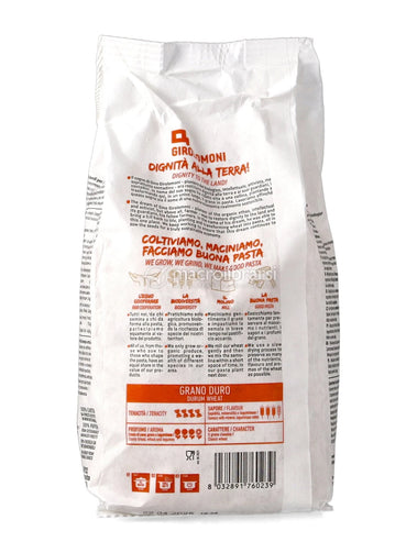 La pasta di semola di grano duro è ottenuta esclusivamente con grani duri coltivati in Italia con metodo rigorosamente biologico.